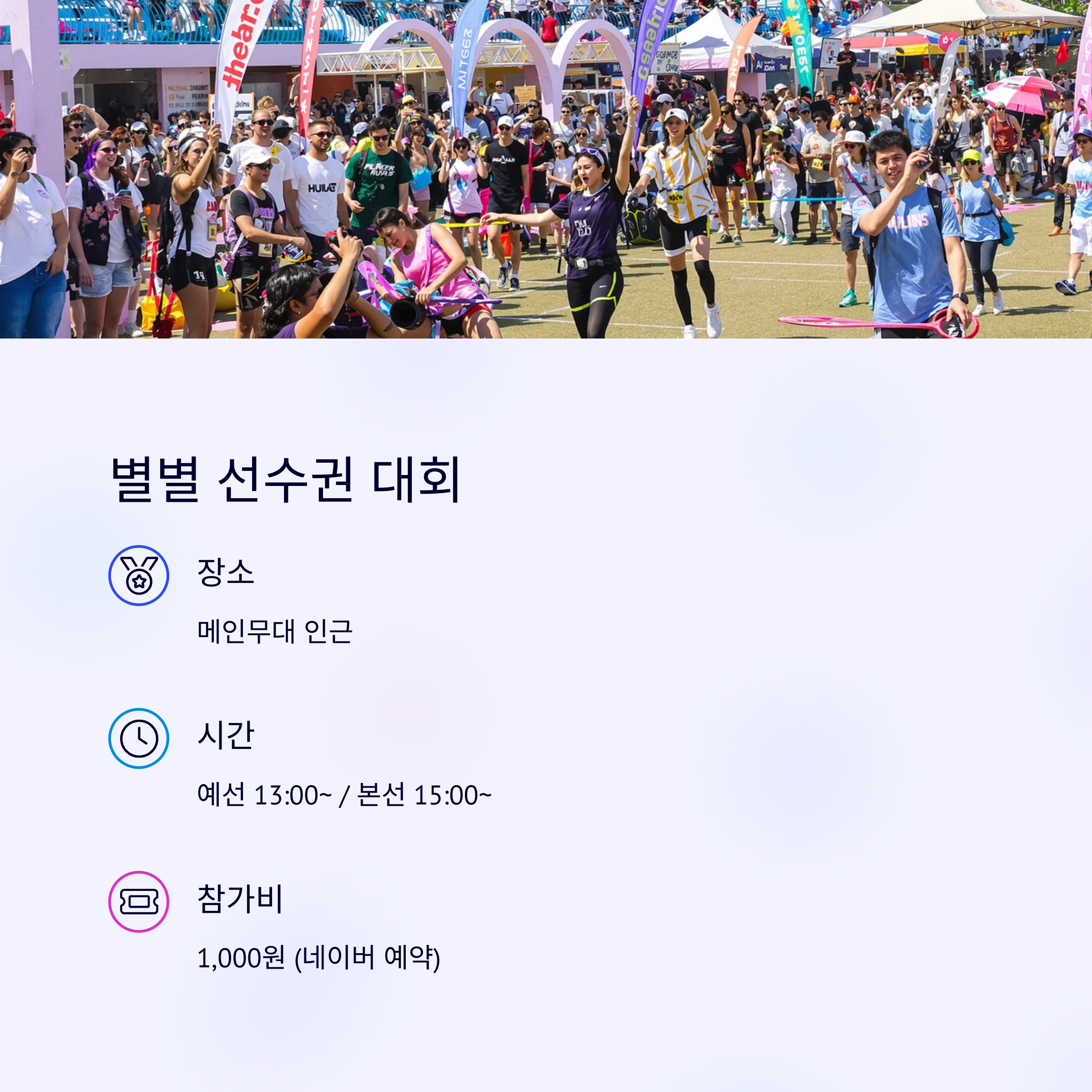 별별 선수권 대회 메인무대 인근 예선 13:00~ / 본선 15:00~ 회당 100명 1,000원 네이버 예약
